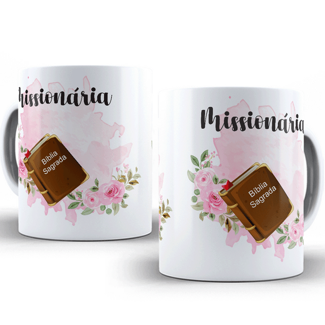 Caneca de cerâmica 11oz, com estampa delicada escrita “Missionária” e detalhes florais com a Bíblia Sagrada, perfeita para presentear uma mulher de fé e propósito.