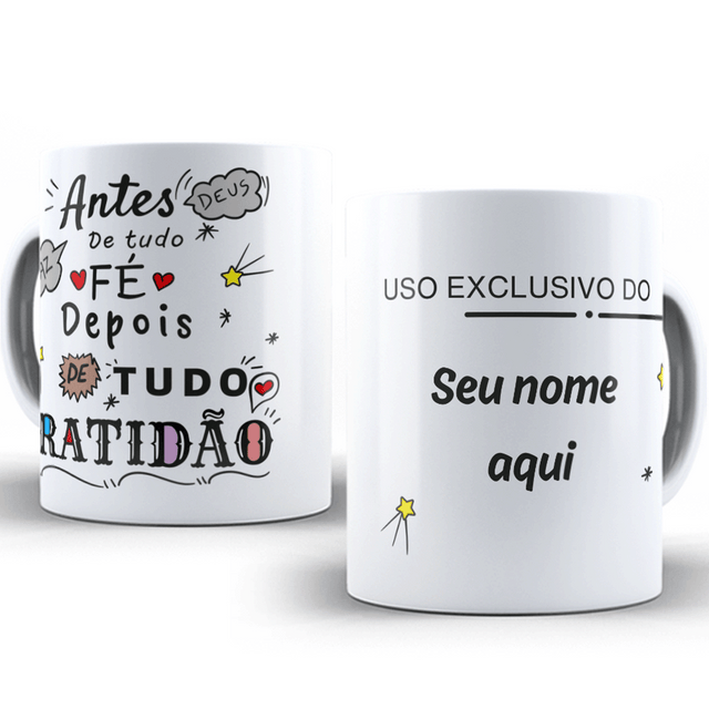 Caneca de cerâmica 11oz, com a frase “Antes de tudo, fé. Depois de tudo, gratidão” e espaço para personalizar com o nome desejado.