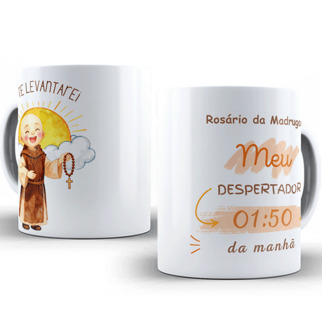 Caneca de cerâmica 11oz, com estampa delicada e cheia de significado, inspirada no Rosário da Madrugada, perfeita para acompanhar seus momentos de oração ou presentear alguém especial.