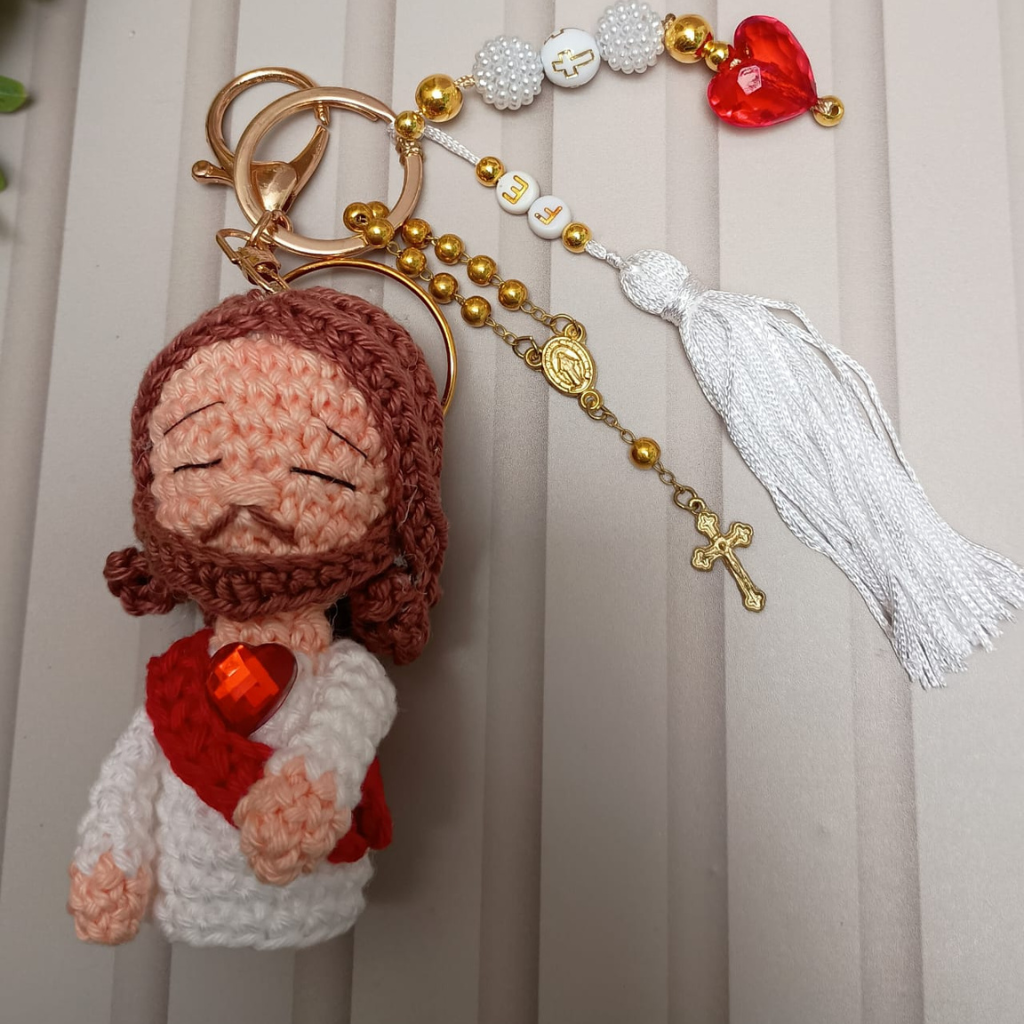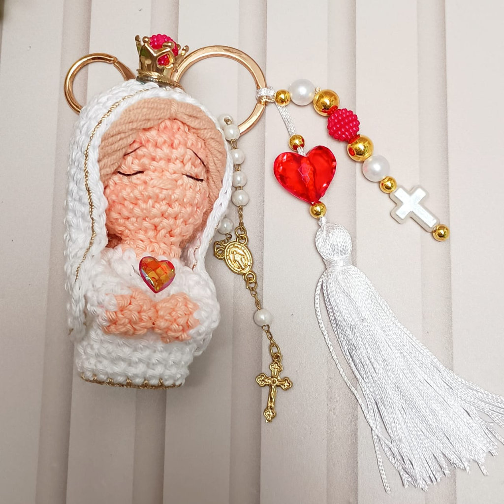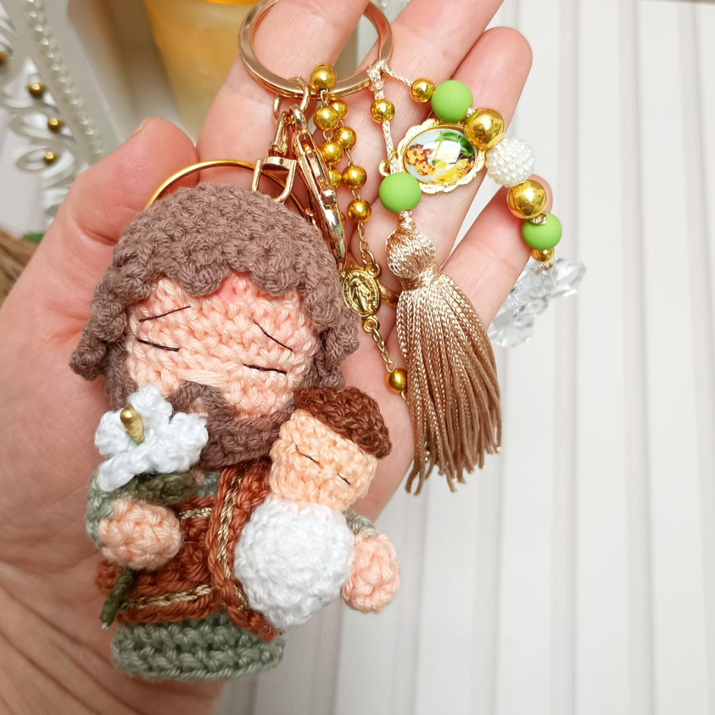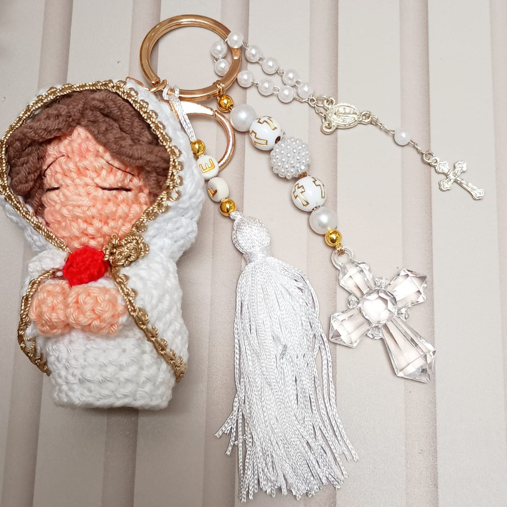 Encante-se com nossos delicados chaveiros de crochê inspirados em santos e símbolos da fé católica!