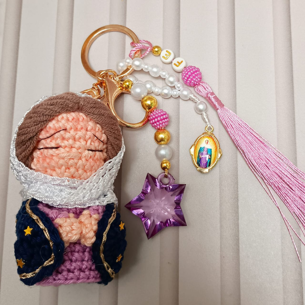 Detalhes em miniatura, expressões meigas e cores suaves tornam esses chaveiros perfeitos para presentear ou carregar sempre com você como um sinal de devoção e proteção.