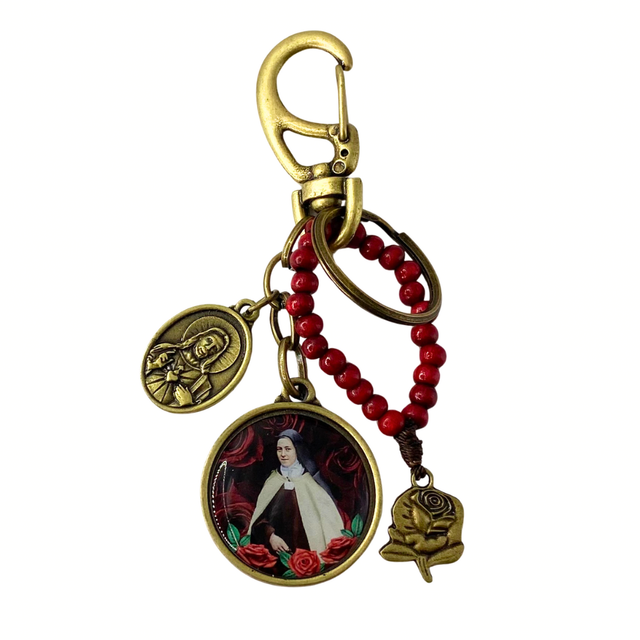 Este chaveiro é dedicado a Santa Teresinha do Menino Jesus, conhecida como a “santa das rosas” e símbolo de amor, humildade e confiança total em Deus.