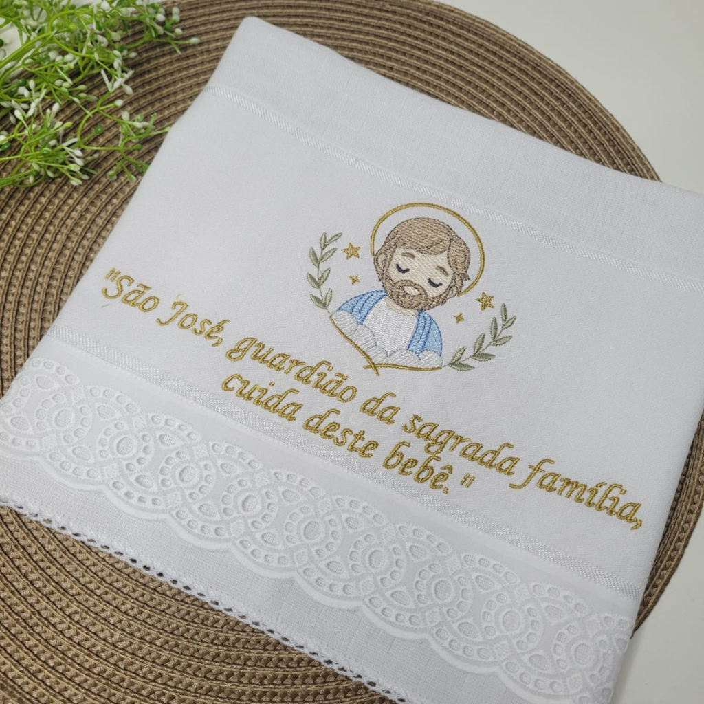 Cada peça traz um bordado exclusivo com inspiração religiosa, acompanhado de frases que transmitem proteção, amor e bênçãos.