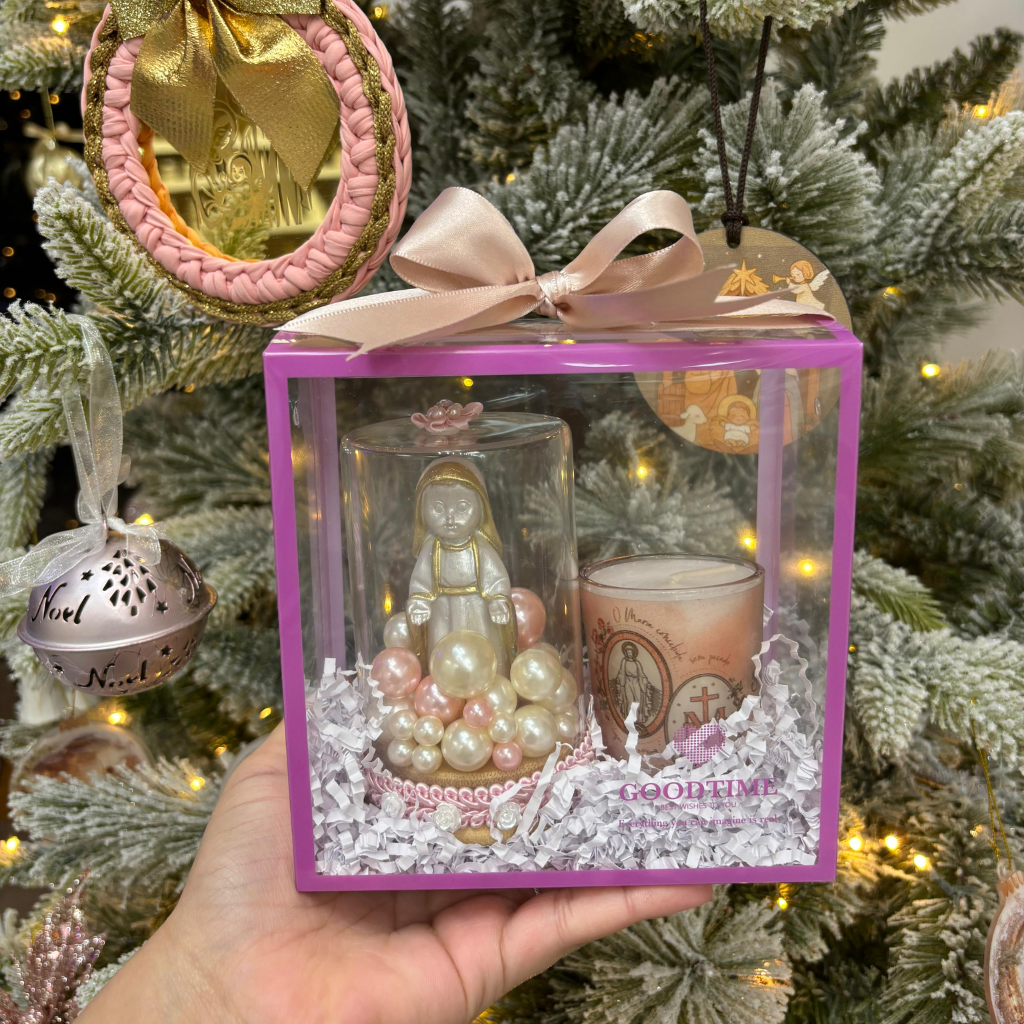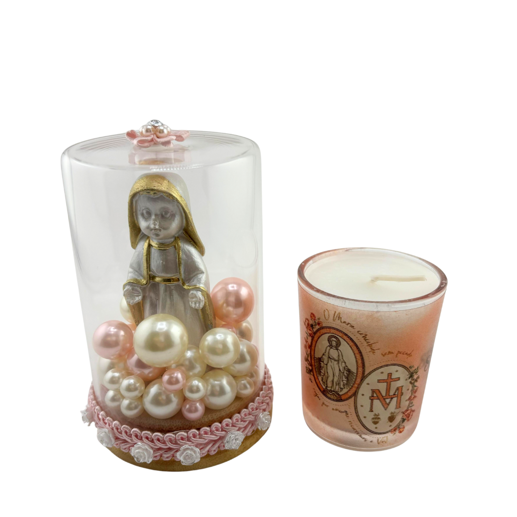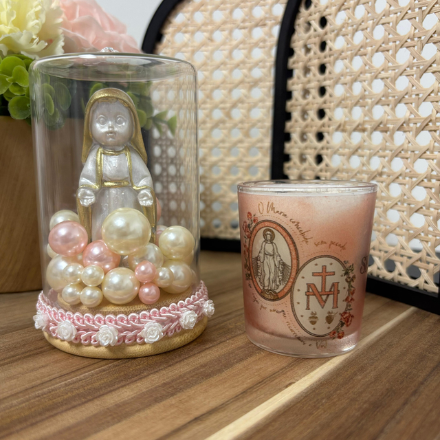 Com a imagem de Nossa Senhora das Graças em redoma decorativa, acompanhada de uma caneca temática, este conjunto foi pensado para transmitir paz, devoção e proteção.
