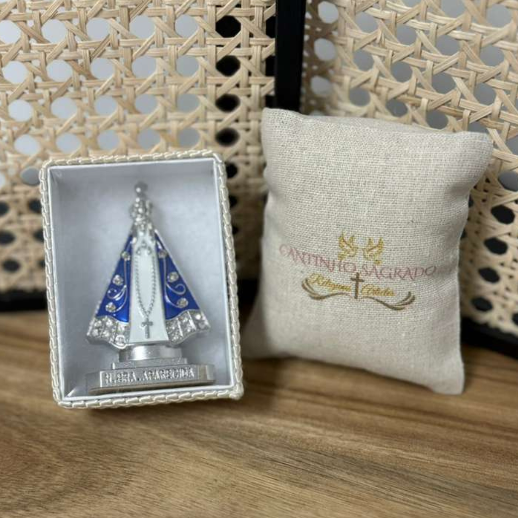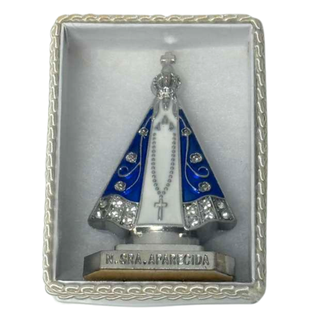 Esta imagem em metal, com acabamento prata e manto azul enfeitado com strass, foi feita para ser colocada no painel do carro, mantendo sua fé presente também no caminho.