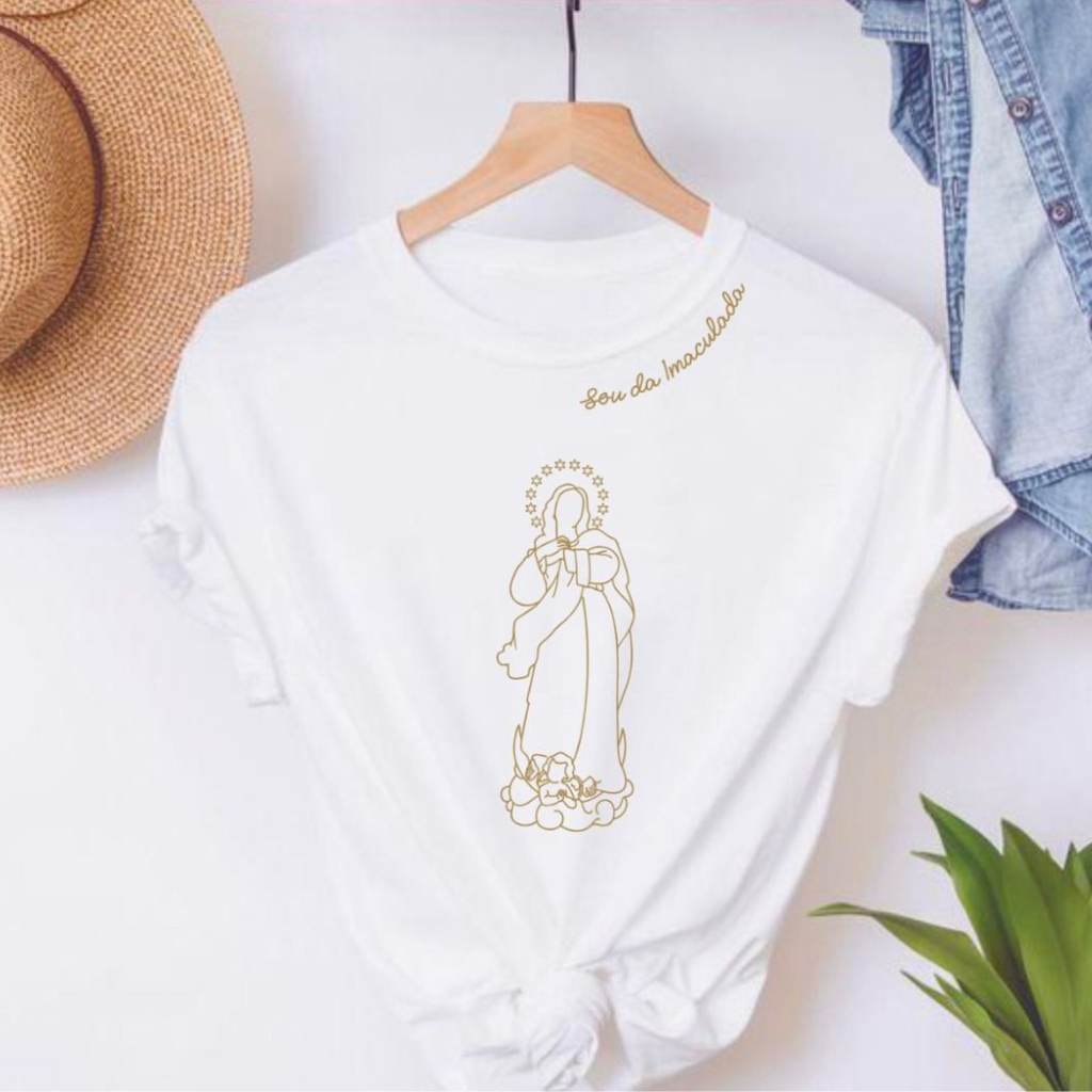 Delicate and full of meaning, this baby look features the minimalist art of Our Lady of the Conception in golden lines, accompanied by the phrase “I am of the Immaculate.”