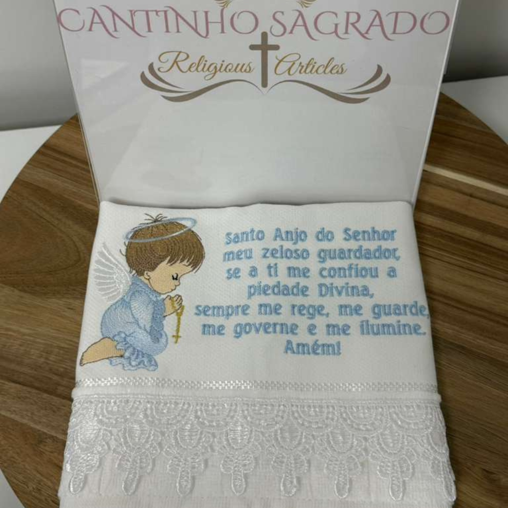 Delicately embroidered with the traditional prayer to the Guardian Angel, this small towel features a little angel praying in soft tones and finished with white lace, bringing a classic and pure touch.