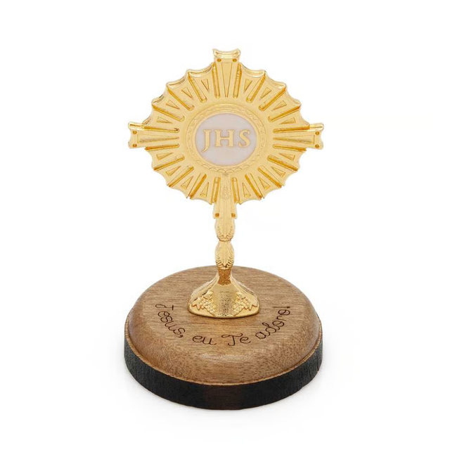 A monstrance made of wood and gilded metal, enriched with resin, features the message "Jesus, I adore You" laser-engraved with precision.