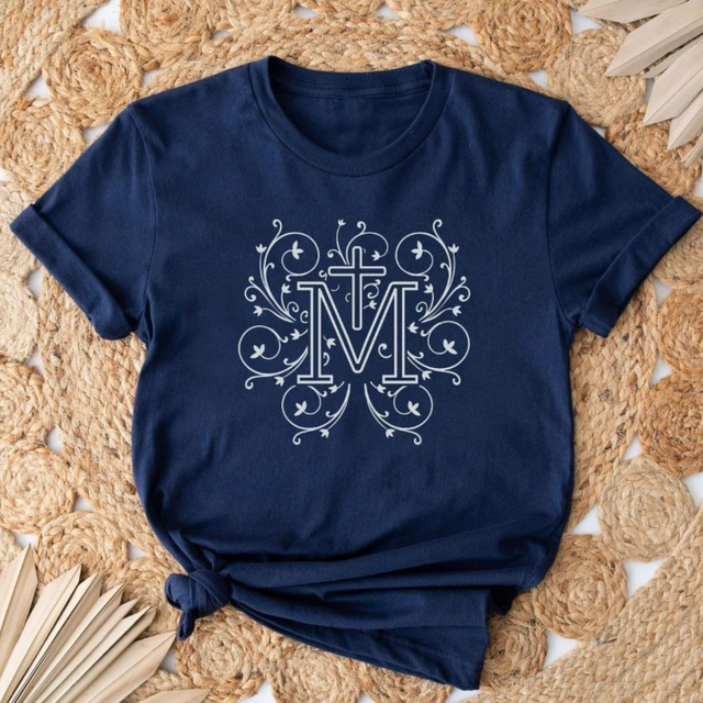 With the Marian symbol printed in white, this navy blue t-shirt is a reminder of Our Lady's maternal presence in our lives.