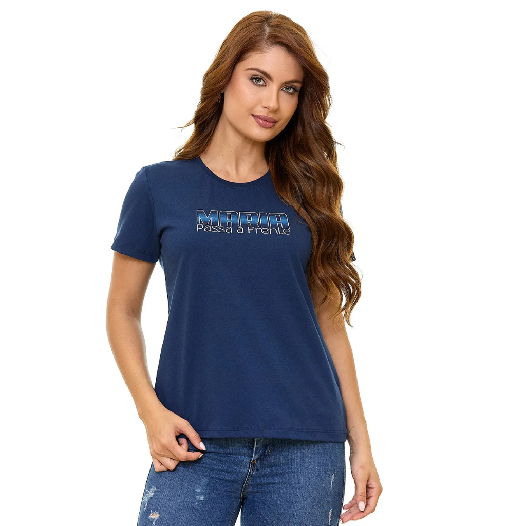 A Marian classic with presence and style. This navy blue babydoll features the message "Mary passes ahead" on the front, and the back features a silk-screened image of Our Lady of Grace, with soft lines and a highly durable finish. The 100% cotton fabric offers all-day comfort, and the fit delivers elegance and understated style. Available in both men's and women's versions, perfect for couples.