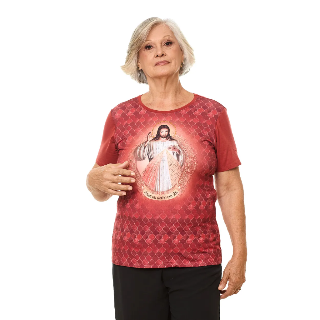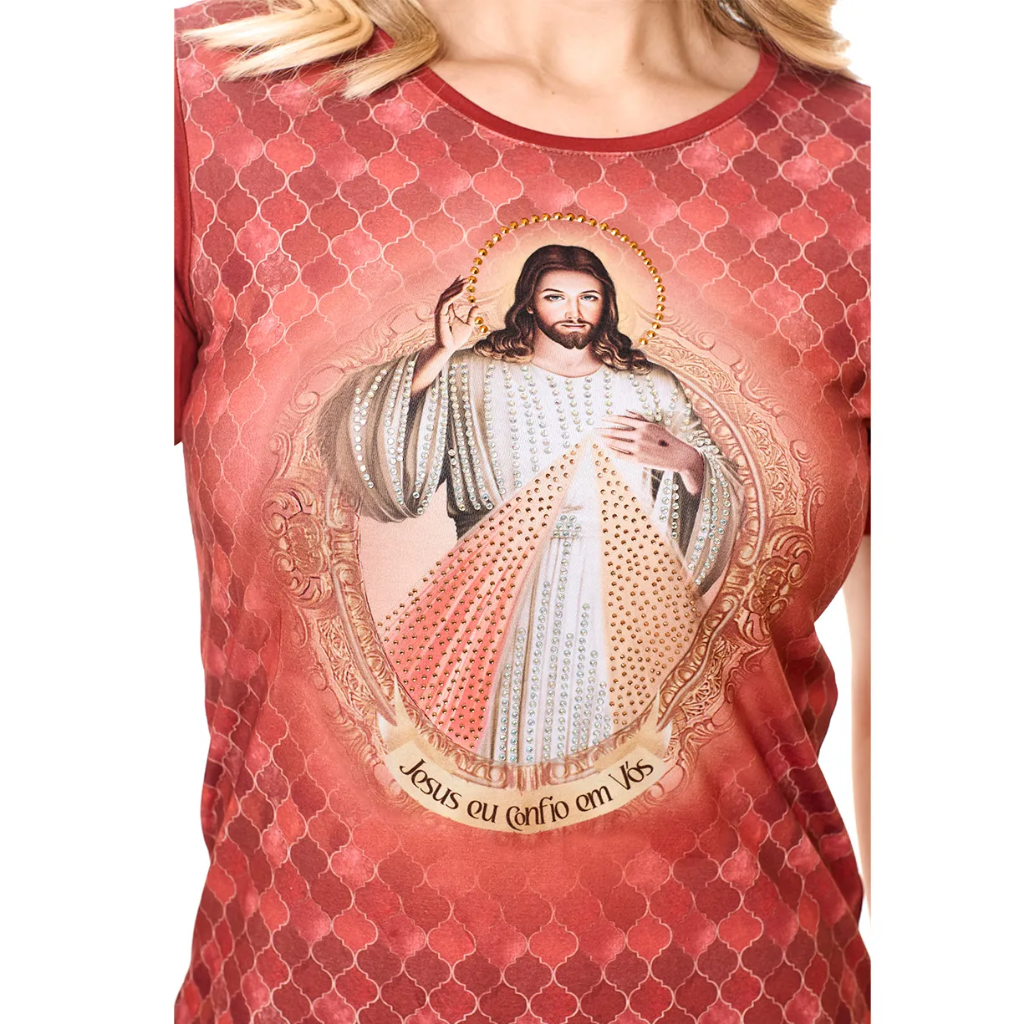 Catholic Baby Look with Merciful Jesus print in terracotta color, made from high quality and durable fabric, with delicate details that add sophistication to any look.