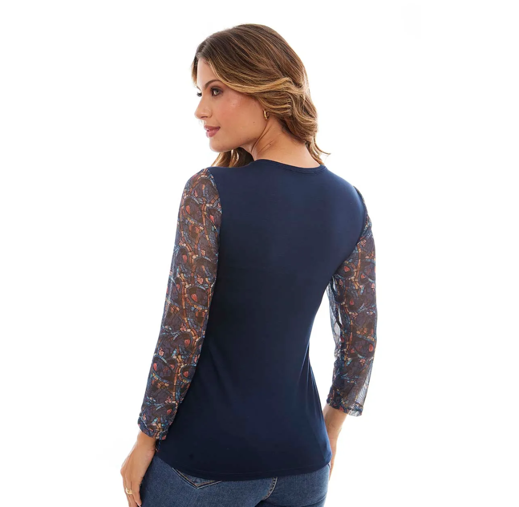 Navy blue blouse with exclusive original details, stass application and tulle sleeves producing a magnificent and very elegant effect on the piece.