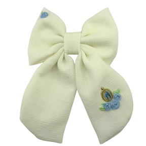 A children's bow made of light-colored fabric, with delicate embroidery of Our Lady and blue flowers that evoke purity and protection.
