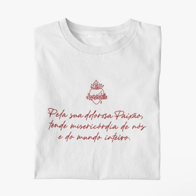 White t-shirt with a detail of the Sacred Heart of Jesus printed in red, accompanied by the phrase: “For the sake of his sorrowful Passion, have mercy on us and on the whole world.”
