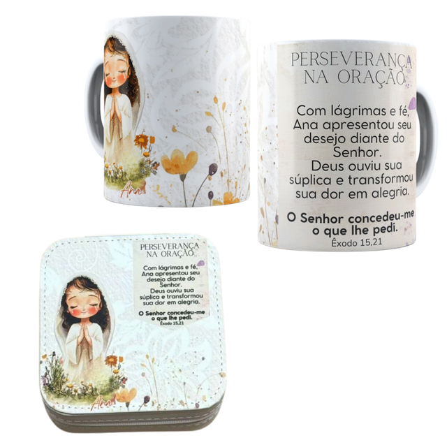 Este kit reúne uma caneca devocional e um porta-joias delicado, trazendo uma mensagem de esperança e confiança no Senhor para o dia a dia.