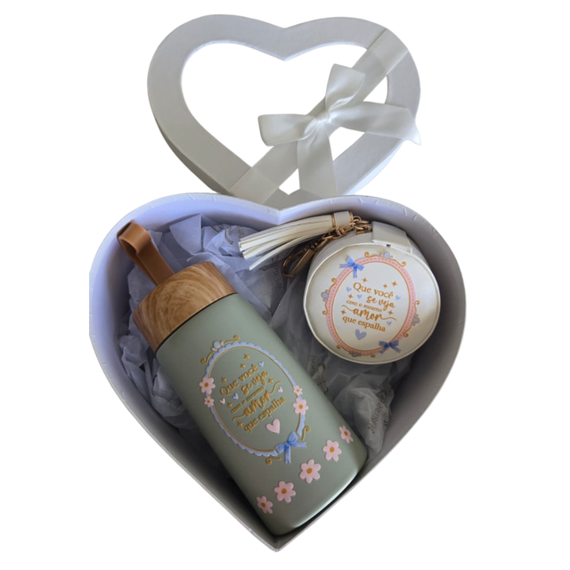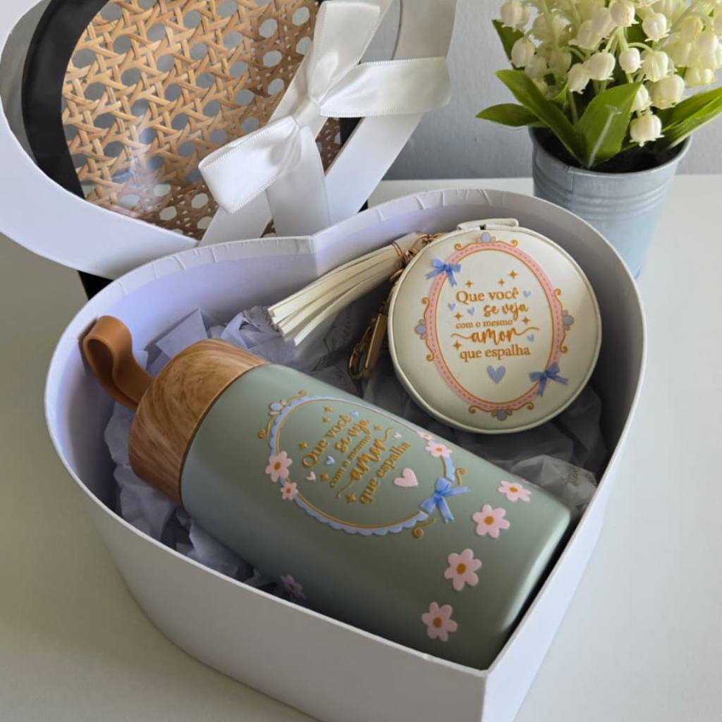 Acompanha uma garrafa térmica e um porta-objetos com a frase inspiradora “Que você se veja com o mesmo amor que espalha”.