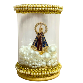 Decorative glass dome with an image of Our Lady of Aparecida in shades of brown and gold, surrounded by pearls that evoke royalty and Marian devotion.