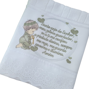 The embroidery depicts a kneeling angel in prayer, accompanied by the prayer to the Guardian Angel in soft shades of green, forming a harmonious and serene composition.