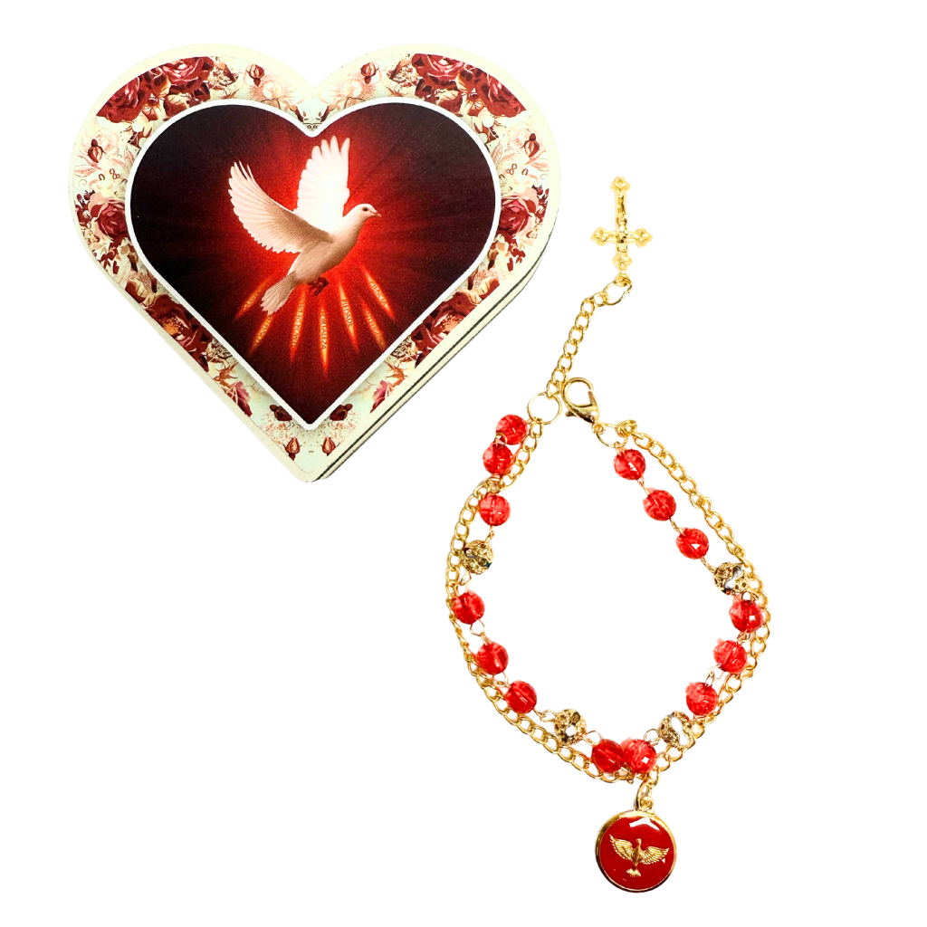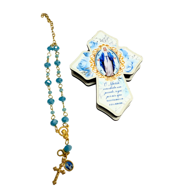 The bracelet with gold details comes with a beautiful box in the shape of a cross or heart with the image of Our Lady of Graces and the prayer: “O Mary conceived without sin, pray for us who have recourse to you”, or Holy Spirit.