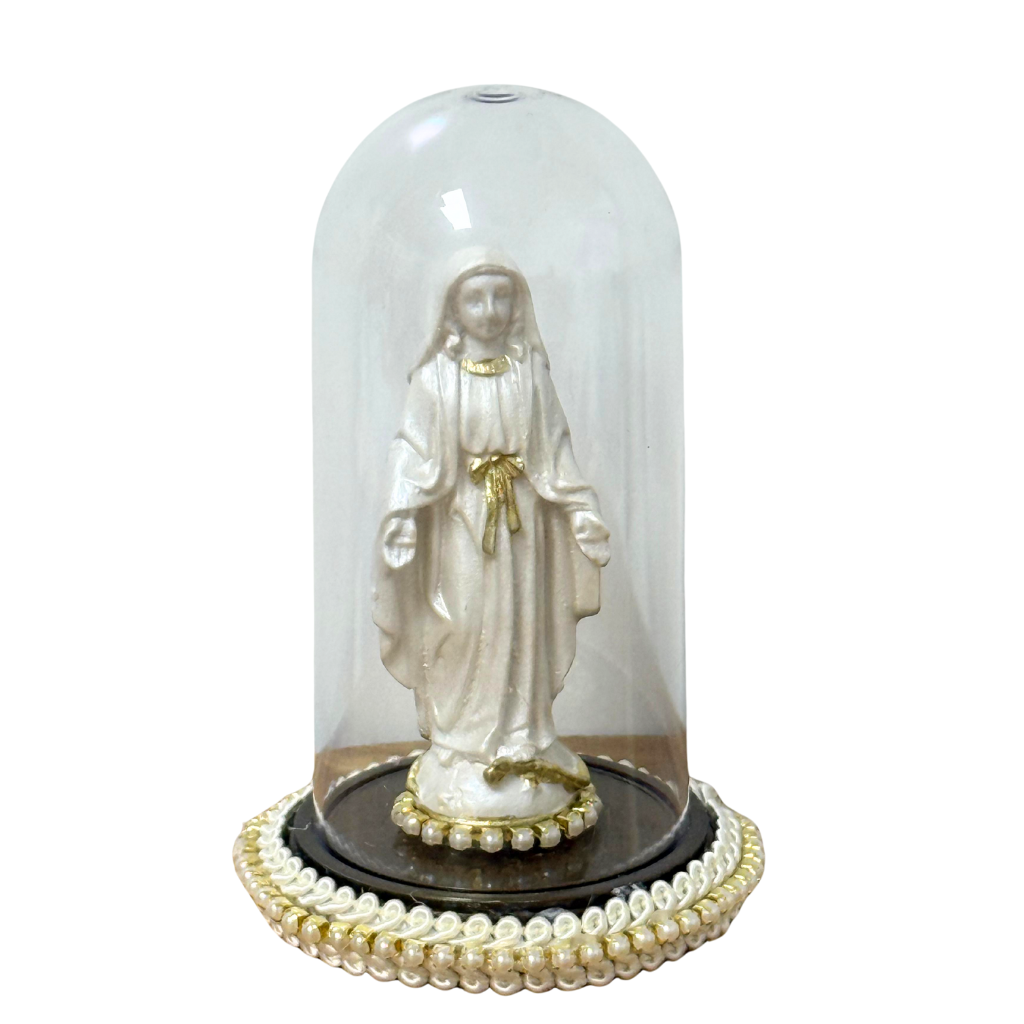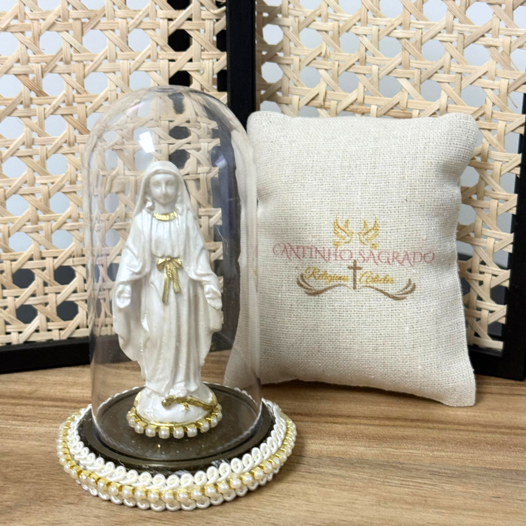 A imagem de Nossa Senhora das Graças em acabamento perolado, protegida pela redoma transparente e apoiada sobre base decorada com pérolas e detalhes dourados, transmite paz, pureza e um toque de encanto artesanal.