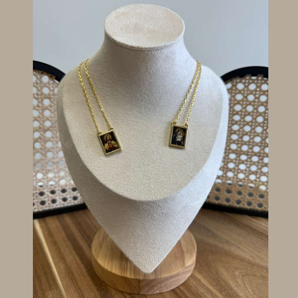 This gold-plated scapular features the Sacred Heart of Jesus on one side and Our Lady of Mount Carmel on the other, representing surrender and trust in divine providence.