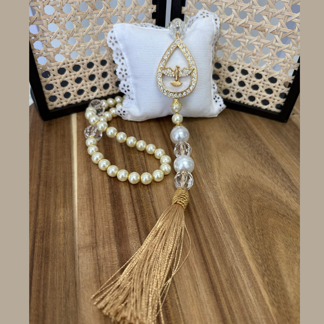 Elegance and faith come together in this decorative rosary with a teardrop-shaped pendant studded with rhinestones and an image of the Holy Spirit.