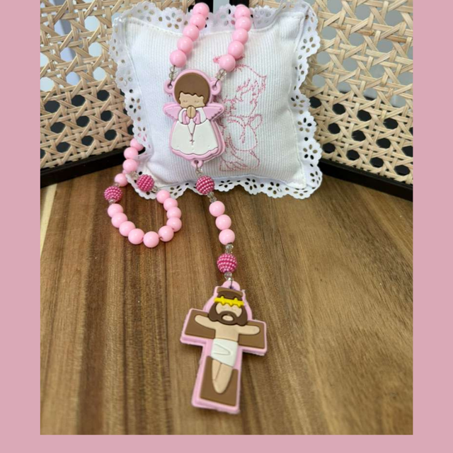 Terço infantil macio e colorido, feito em silicone atóxico com design de anjinho orante e cruz de Jesus.