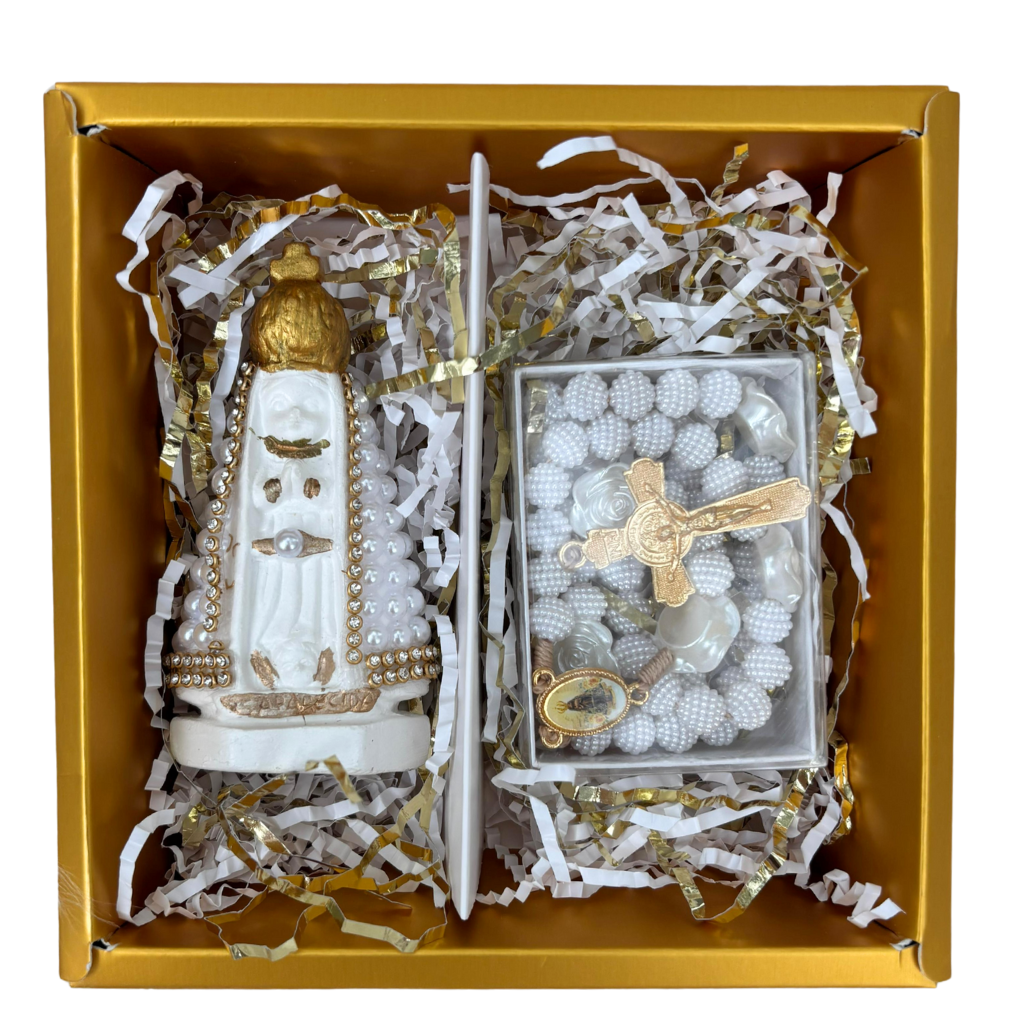 It includes an image of Our Lady of Aparecida, entirely crafted from pearls and gold embellishments, along with a matching rosary.