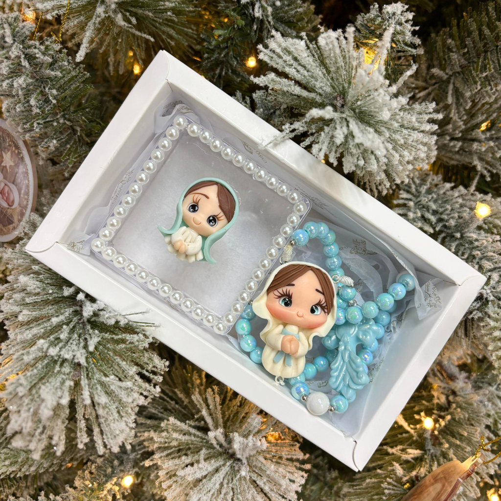 Composed of a super delicate rosary box of Our Lady and a pearly blue rosary, it is a lovely gift that conveys peace, protection, and the tenderness of the Mother of God.