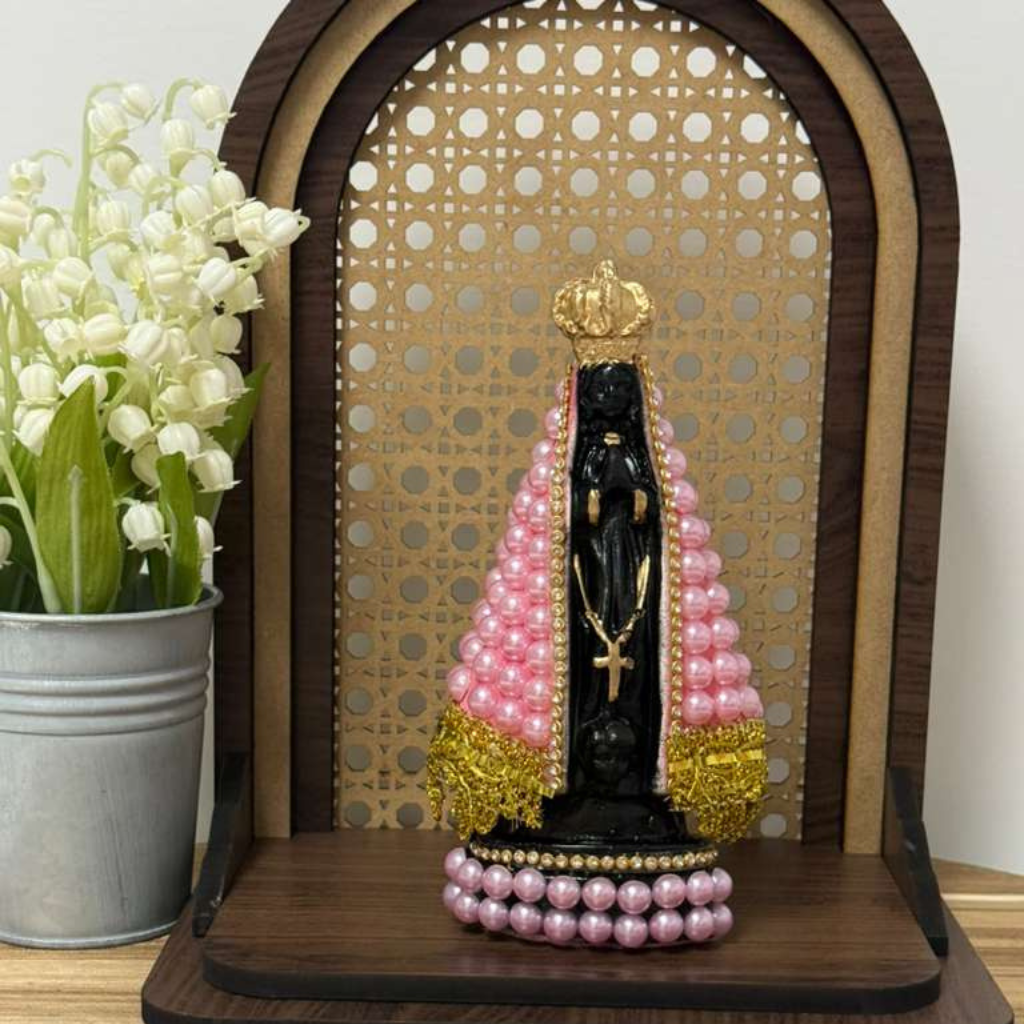Nossa Senhora Aparecida em tom preto com delicados detalhes em pérolas rosa e acabamentos dourados.