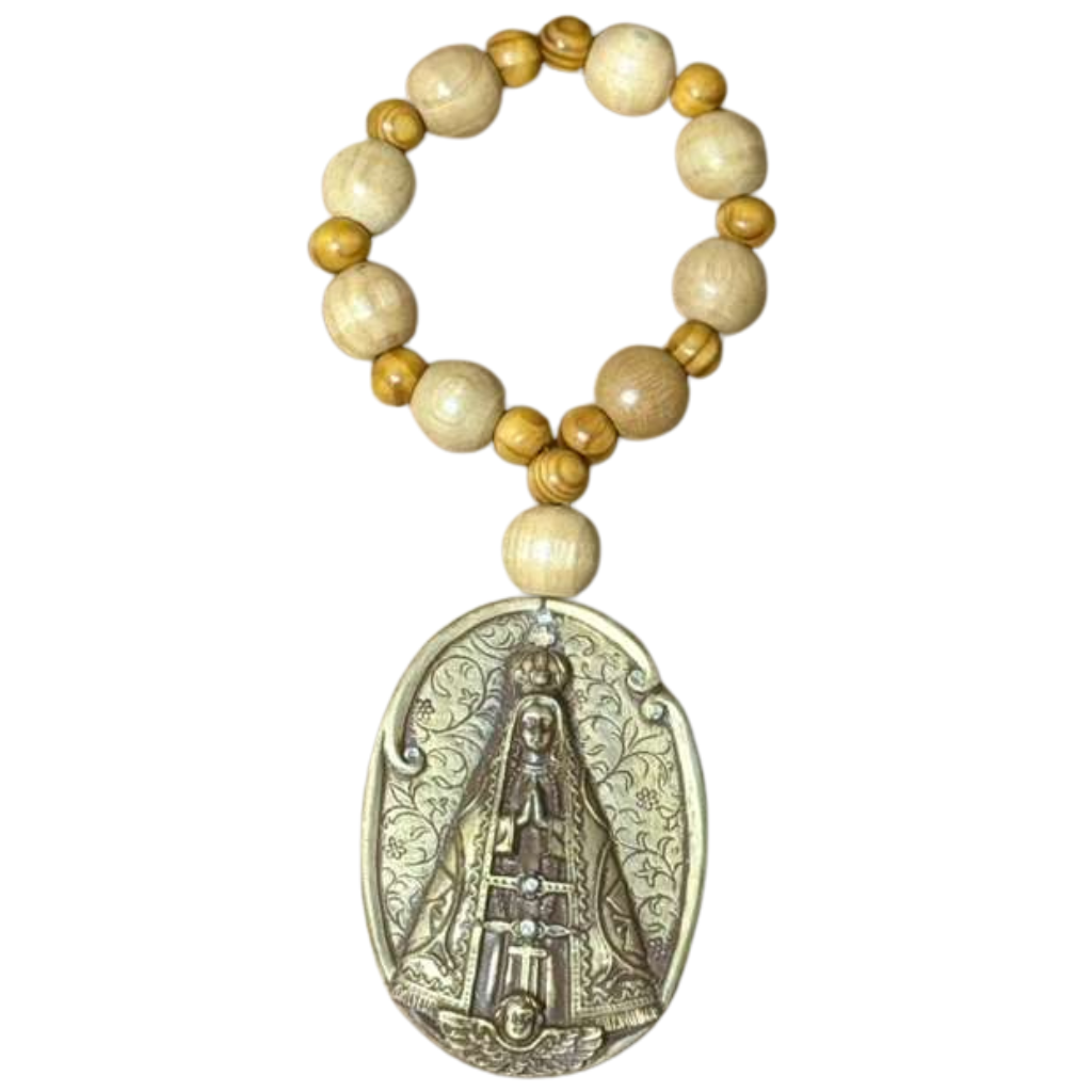 Com acabamento delicado e detalhes artesanais, a peça carrega a imagem de Nossa Senhora Aparecida, símbolo de fé, proteção e esperança, convidando à oração e à confiança em sua intercessão.