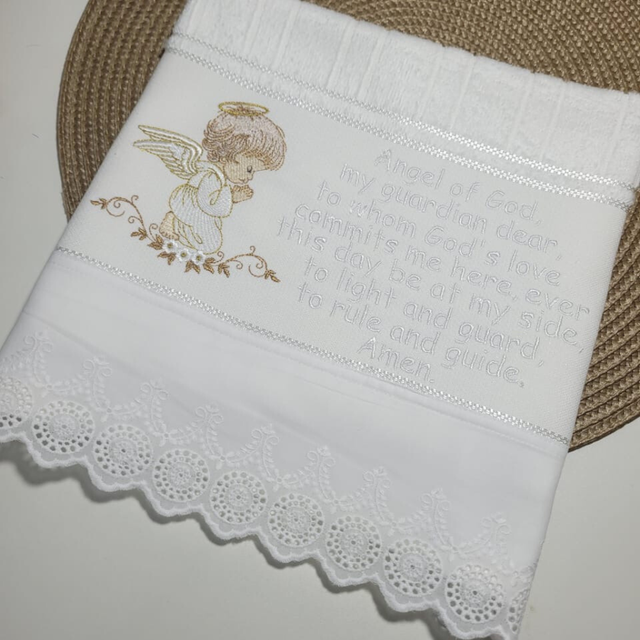 Com toque macio, bordado delicado e acabamento em renda, é uma peça que transmite proteção, fé e ternura. Ideal para o dia a dia, para compor um lavabo com propósito ou para presentear alguém especial, especialmente crianças e famílias.