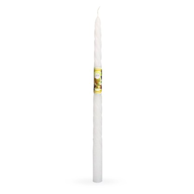 Twisted paraffin candle with First Communion themed sticker. It measures 29 cm in height and 1.7 cm in diameter.