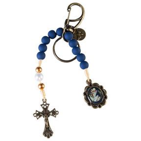 El llavero “Madres que oran por sus hijos” está elaborado con cuentas de goma de 8 mm en color azul, con acabado oro antiguo, y mide 14 cm de largo.