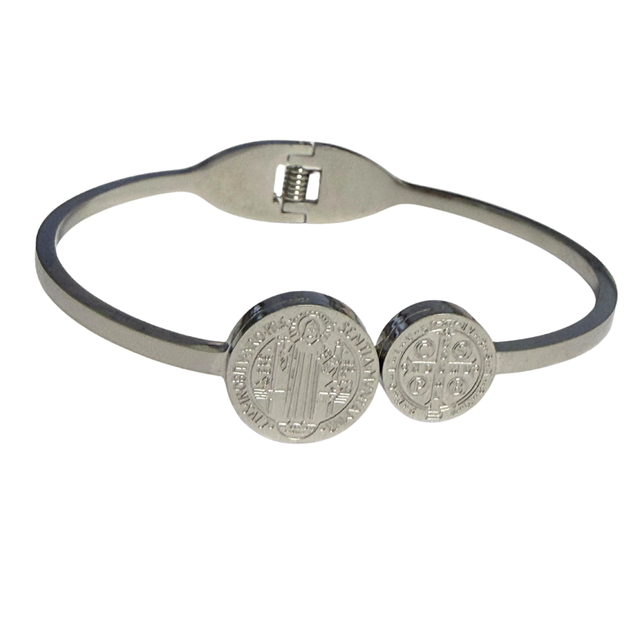 Conjunto de Pulseras con Medalla de San Benito + "Que la Santa Cruz sea mi Luz" COLOR PLATA