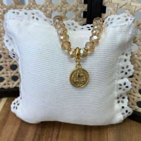 Elegante y luminosa, esta pulsera semipreciosa está realizada con cristales dorados y una medalla de San Benito bañada en oro.