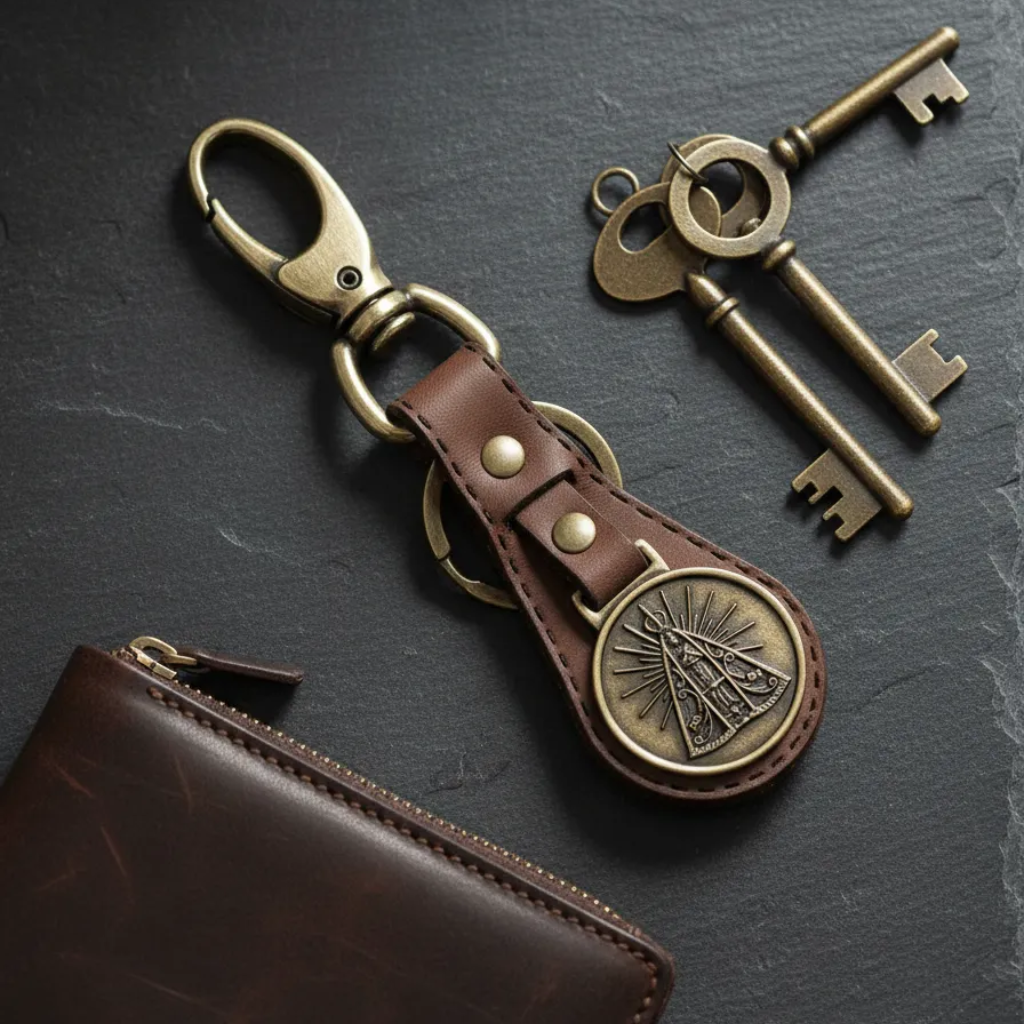Llavero de Nuestra Señora de Aparecida con Nudo de Mosca, Cuero Marrón, Metal
