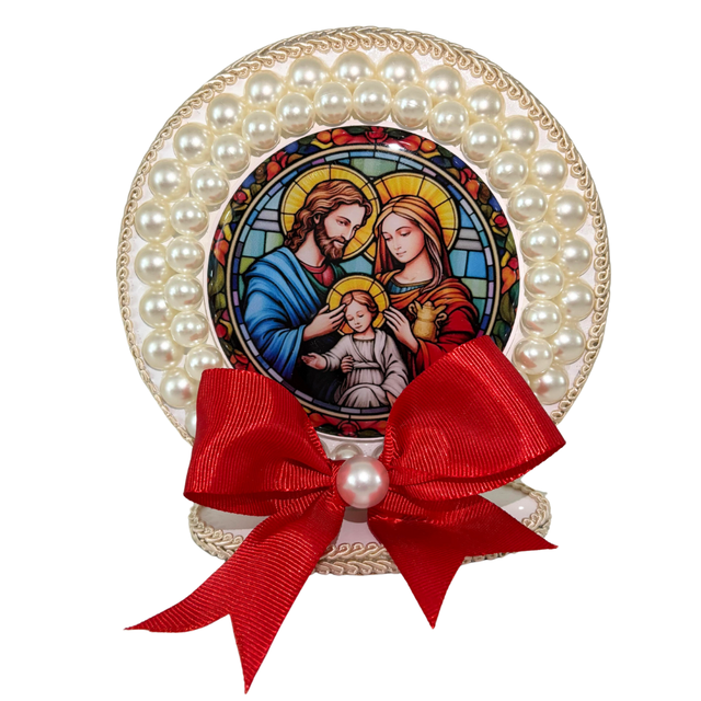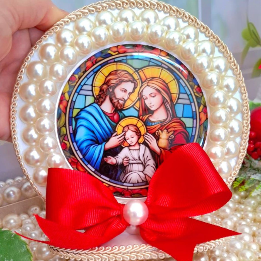 Adorno natalino delicado, com imagem da Sagrada Família, moldura com pérolas e laço vermelho.