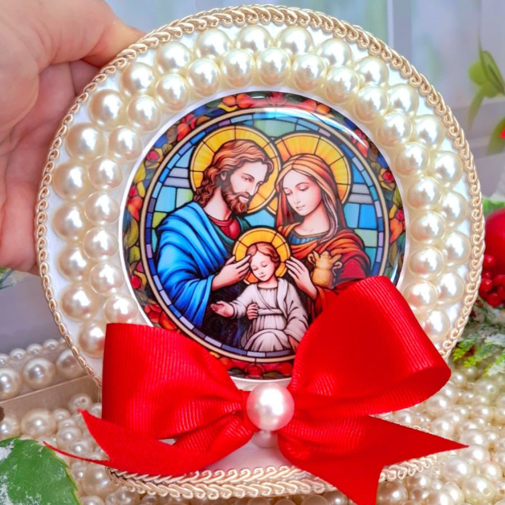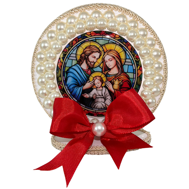 Adorno natalino delicado, com imagem da Sagrada Família, moldura com pérolas e laço vermelho.