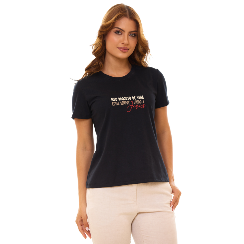 Baby look com a imagem de São Carlo Acutis, em uma composição cheia de fé e reverência. Na cor preto, a peça transmite leveza e harmonia.