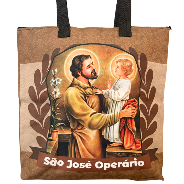 Clássica e acolhedora, esta bolsa apresenta São José com o Menino Jesus, destacando seu exemplo de trabalho, dedicação e amor.