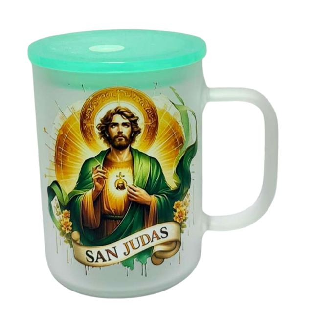 Nossa caneca fosca de San Judas Tadeu traz uma arte vibrante e cheia de luz, destacando o santo das causas impossíveis em detalhes dourados e tons verdes que simbolizam esperança e fé.