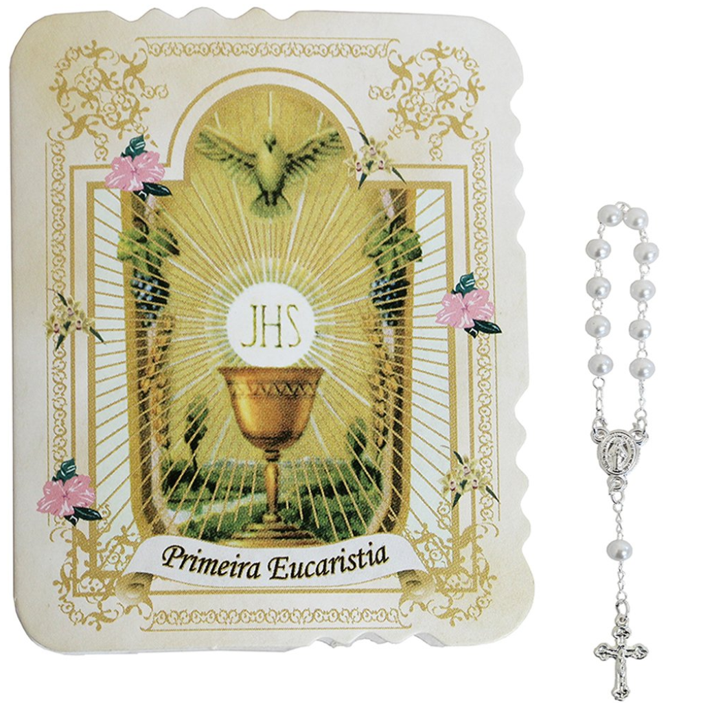 Cartão de primeira eucaristia acompanhado de dezena branca. Fechamento com velcro.