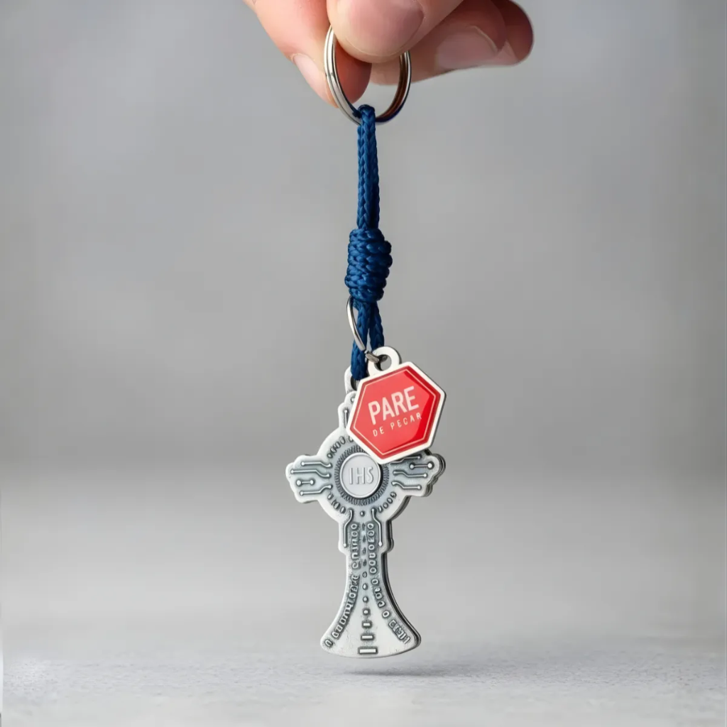 Chaveiro de São Carlo Acutis, uma peça que une fé e estilo em um acessório compacto e significativo.