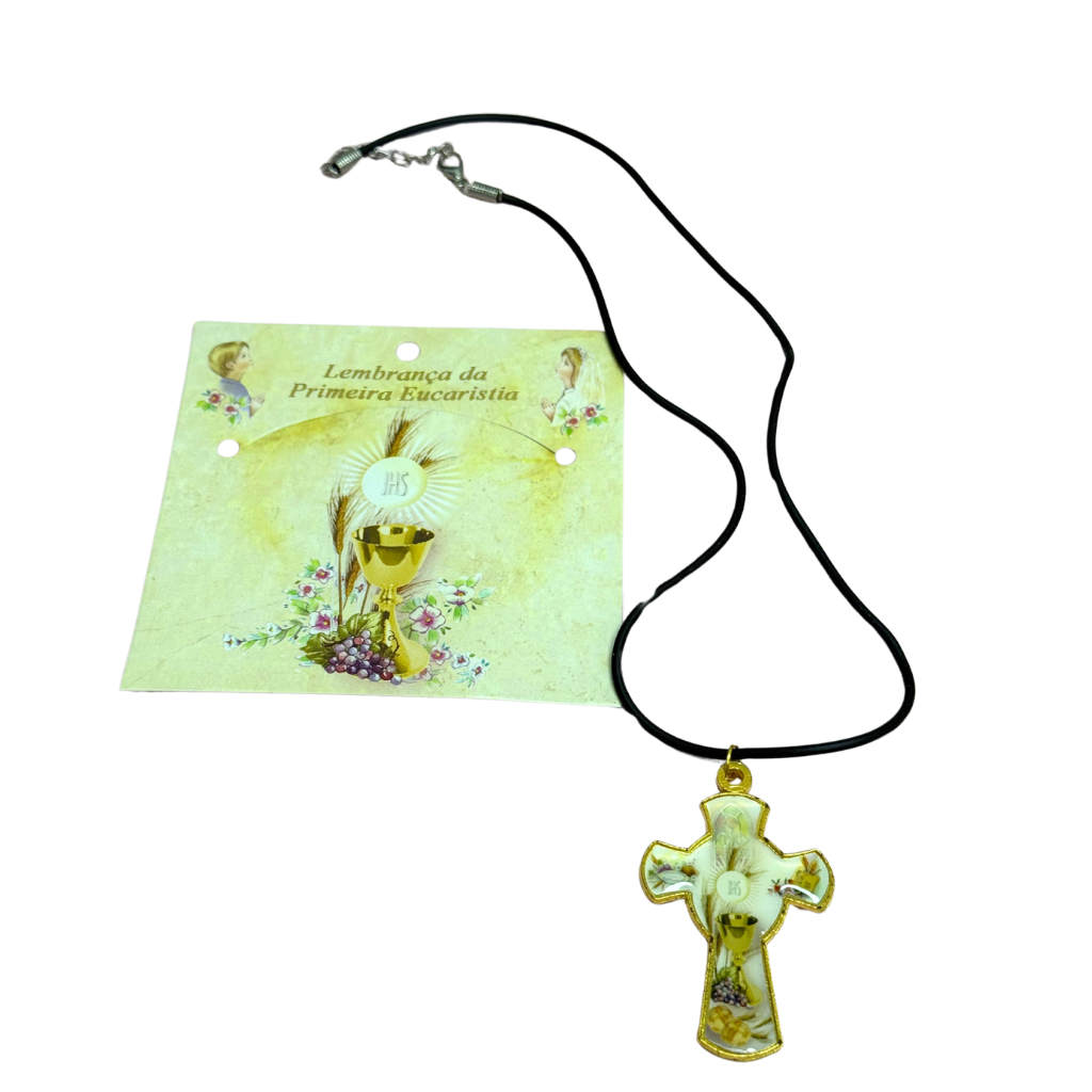 Uma delicada recordação da Primeira Comunhão, esse colar traz um pingente em formato de cruz com acabamento dourado e imagem simbólica da Eucaristia: o cálice, a hóstia consagrada com o monograma “JHS”, trigo e uvas.