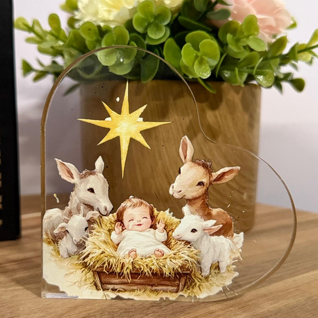 Ele traz uma ilustração suave e cheia de ternura: o Menino Jesus deitado na manjedoura, rodeado pelos animais e iluminado pela Estrela de Belém símbolo da luz divina que guia nossos caminhos.