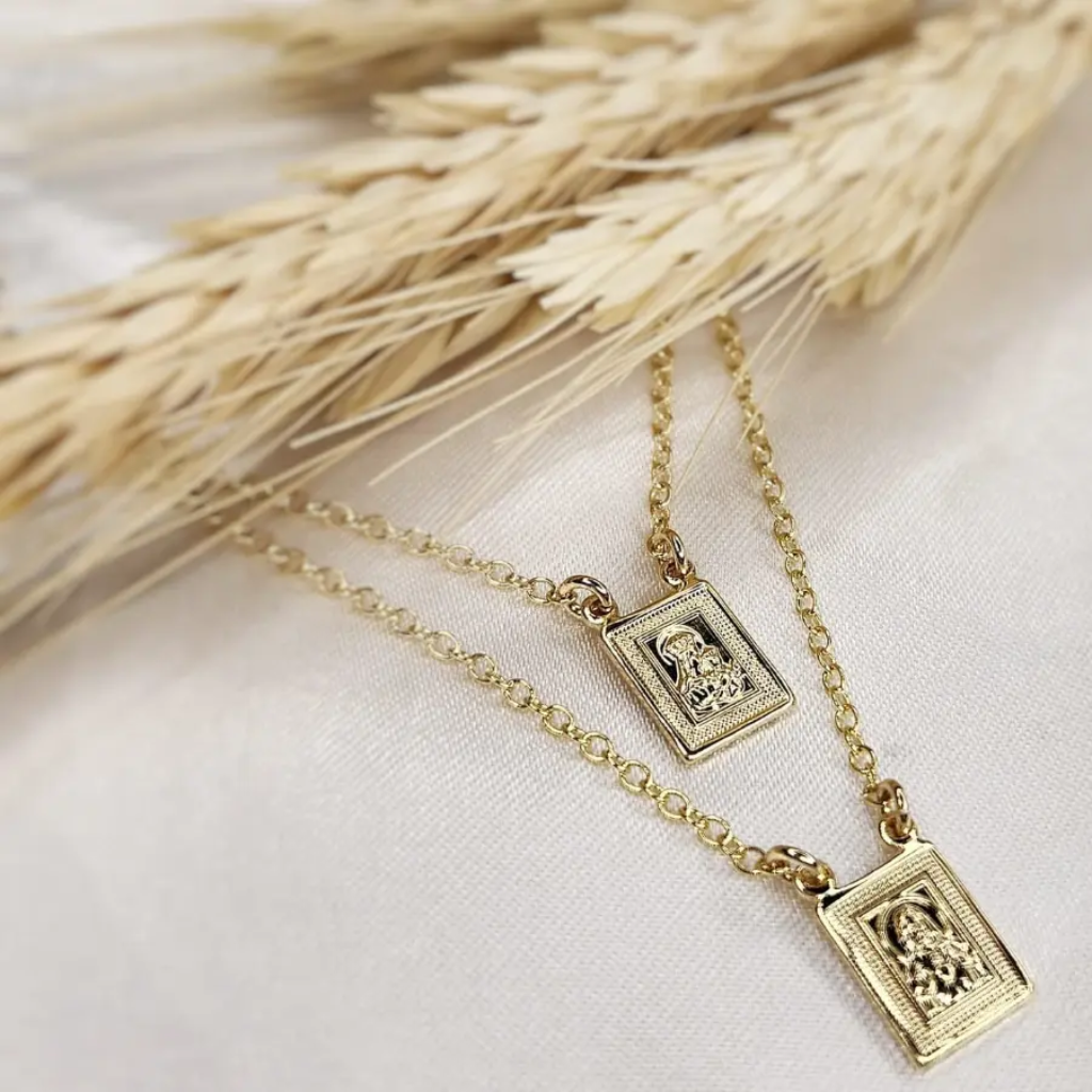 Escapulário com medalhas de Nossa Senhora do Carmo e Sagrado Coração de Jesus.