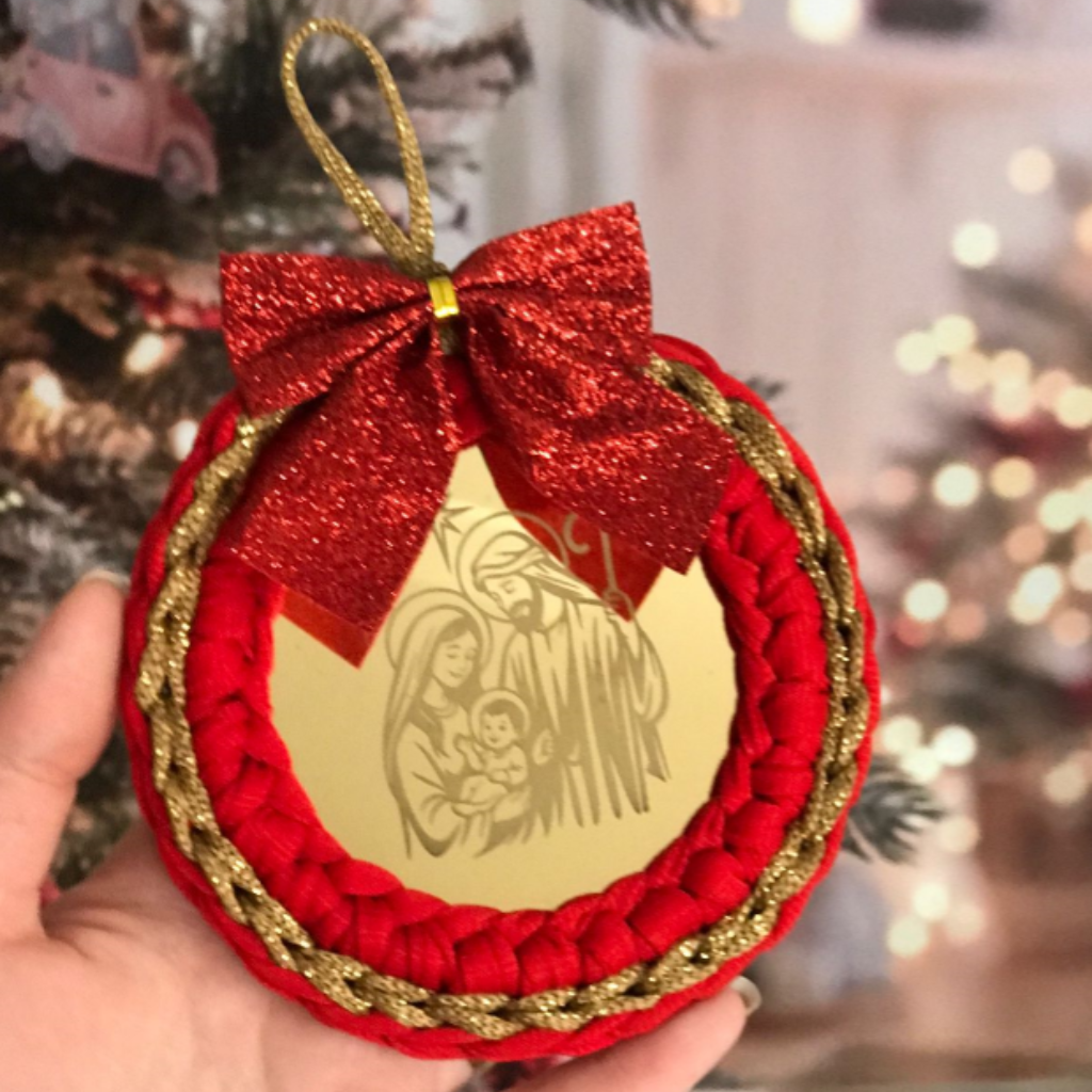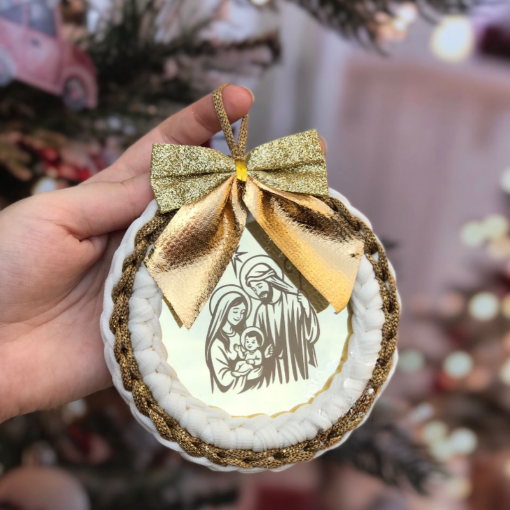 Adorno religioso artesanal confeccionado em crochê, com acabamento delicado e medalha central dourada, símbolo de fé, proteção e devoção.