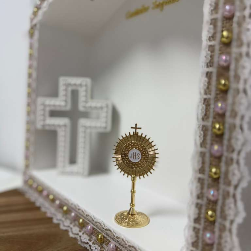 Delicado e cheio de significado, este mini ostensório é perfeito para compor seu oratório, cantinho de oração ou altar decorativo.