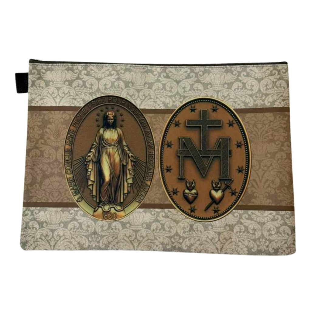 Produzidas em tecido resistente, com impressão de alta qualidade e fechamento em zíper, elas são perfeitas para o dia a dia: levar para a missa, grupo de oração, trabalho, estudos ou deixar dentro da bolsa.